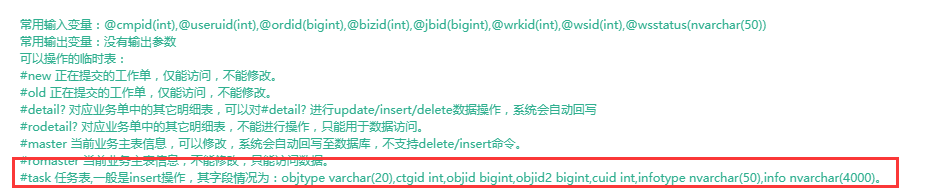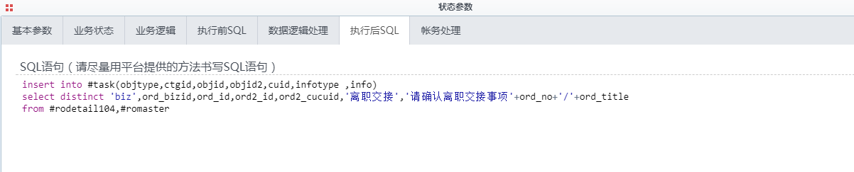 insert into #task (objtype,ctgid,objid,obj2id,cuid,infotype,info) select 'biz',ord_bizid,ord_id,ord2_id,ord2_xxcuid ,'请XXXX','说明内容'+ord_no+'/'+ord_title from #rodetailX,#romaster #task的具体参数: