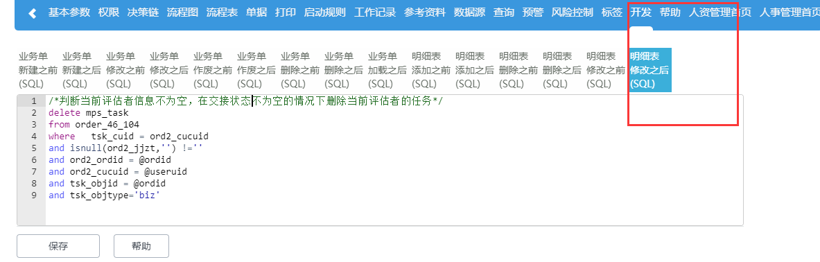 4.在开发”业务加载之后”写入: select '自己定义', datasource (ord2_xxid-@useruid) editable,* from order_x_xx,order_x where ord2_ordid=@ord_id ord_id=@ord_id and (ord2_xxcuid=@useruid or @useruid=ord_createcuid 这是收到任务的对象只能查看自己并编辑自己相应的内容, 5.当提交完成后并删除任务 /*判断当前评估者信息不为空,在交接状态不为空的情况下删除当前评估者的任务*/ delete mps_task from order_x_xx where tsk_cuid = ord2_xxcuid and isnull(ord2_jjzt,'') !='' and ord2_ordid = @ordid and ord2_xxcuid = @useruid and tsk_objid = @ordid and tsk_objtype='biz'