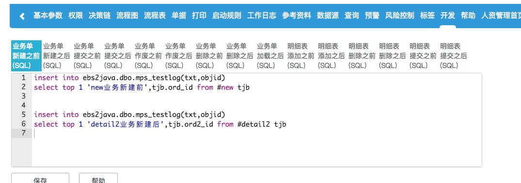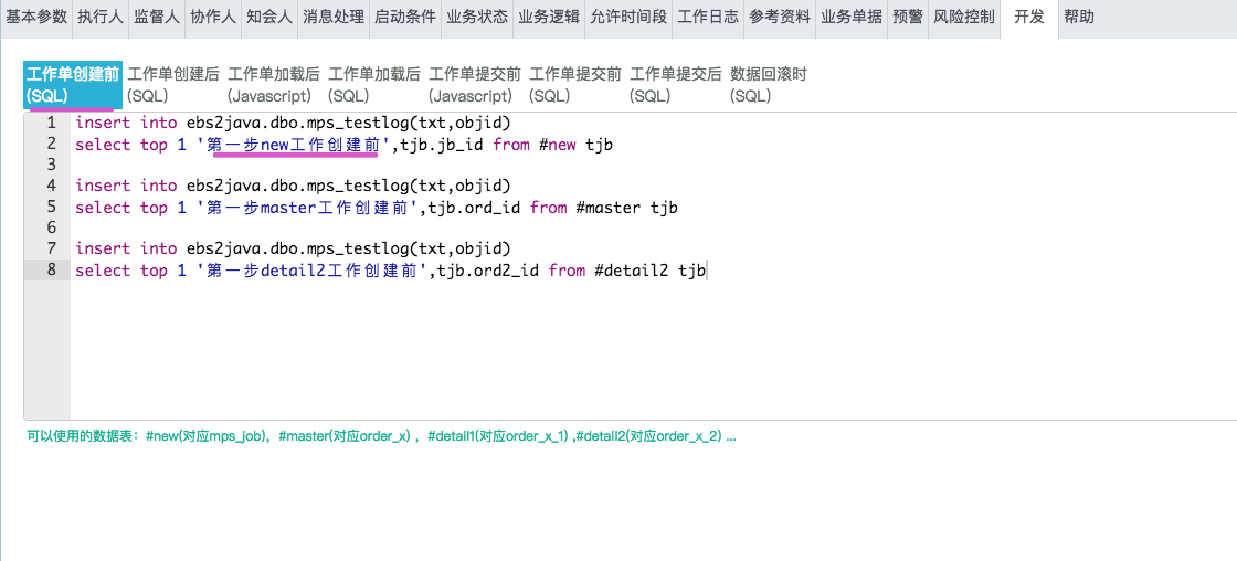 在业务中,系统定义了一些事件,业务事件、节点事件、动作事件,并在相应的事件中提供了相应的数据表和一些常用关键字段的预定义(宏),用于相对复杂的业务进行业务数据回写、抽取、更新和权限等内容的控制。