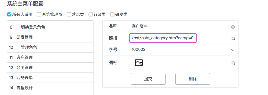 - 红框处表示菜单需带上的客户分类(cctag)和客户类型(ctid),具体参数值可在客户配置界面->基本信息中查看。